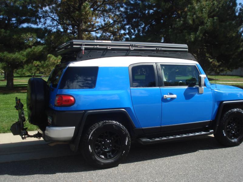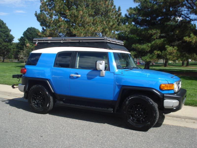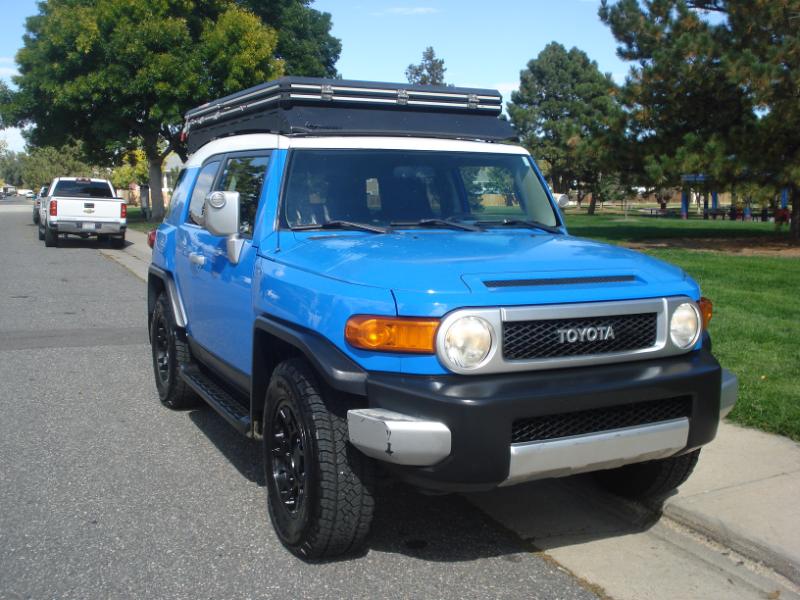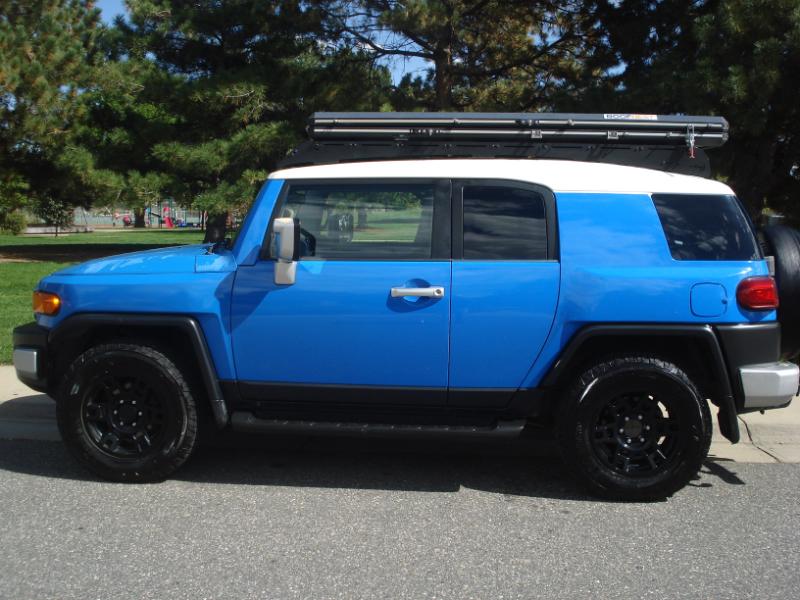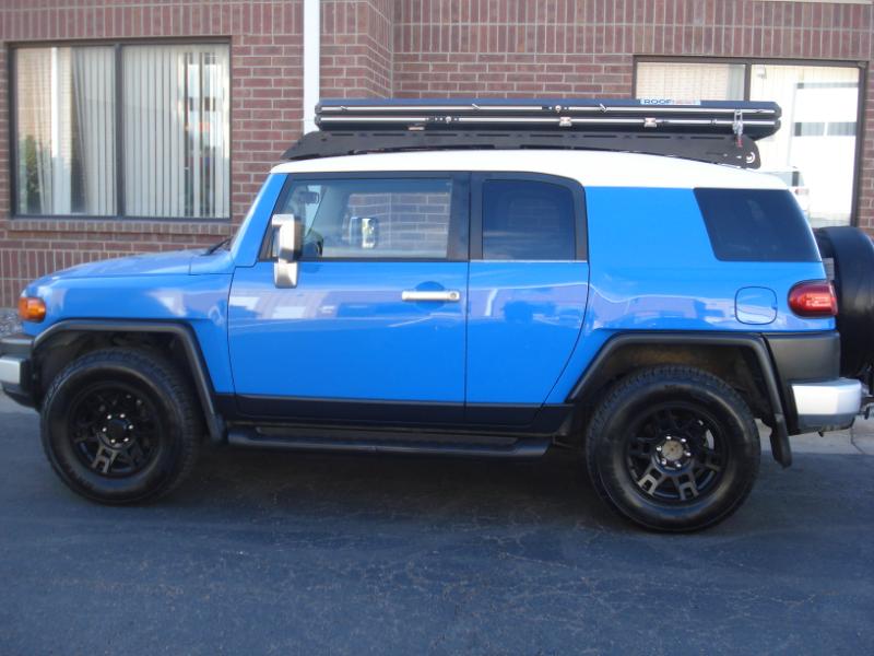 Very hard to find FJ Cruiser 4X4 in the beautiful and very popular Voodoo Blue that's been very well cared for, only 2 owners and clean title. This one has some very nice addons/upgrades: 17" 6 spoke gloss black alloys with General Grabber LT''s, Falcon Roof Nest with ladder(almost $4,000) and Kuat NV 2.0, 2 bike hitch mount($1,000) It also has some nice factory options like Rear sonar(Park assist), Rear diff lock, running boards, Aux audio input, Remote keyless entry with alarm, am/fm/cd and carpeted rear cargo mat!!!